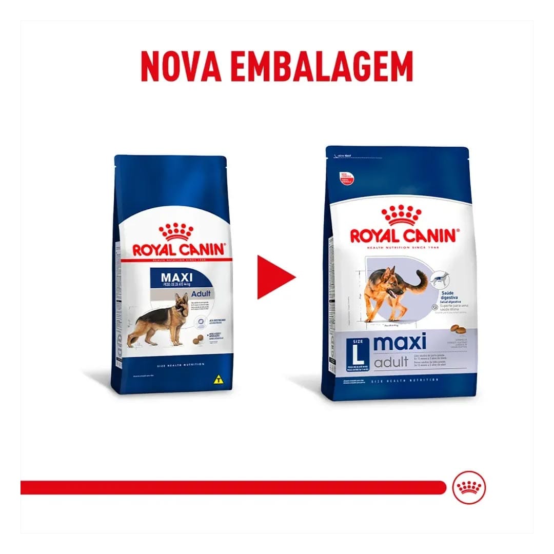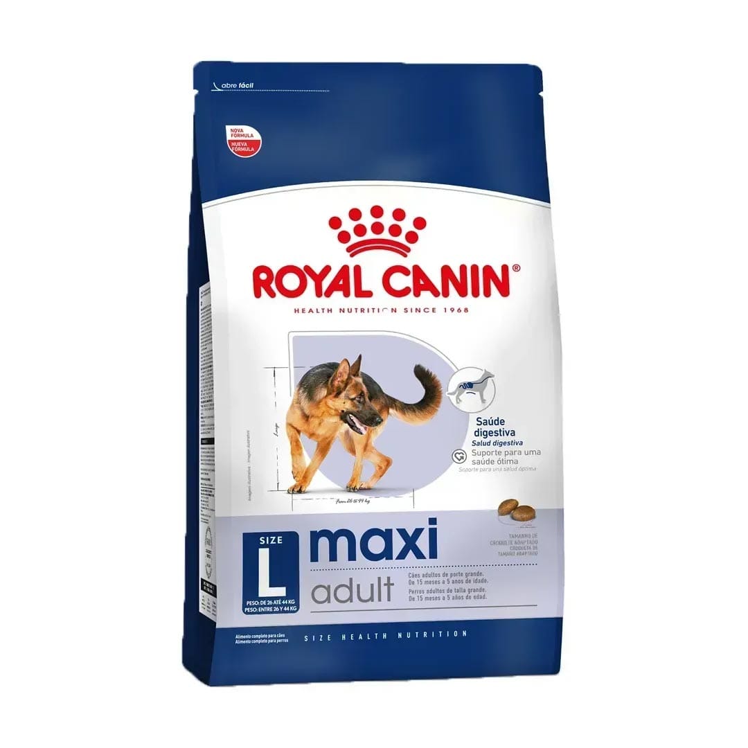 A ração Royal Canin Maxi Adult é um alimento completo indicado para cães adultos de grande porte, a partir dos 15 meses e 5 anos de idade. Classificada como Super Premium, sua fórmula contém vitaminas essenciais para cães com peso entre 26 e 44 kg, garantindo uma nutrição equilibrada e de alta qualidade.